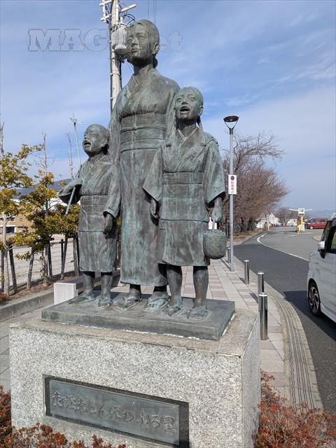 駅のホームそして駅前ロータリーには、「赤とんぼ」の像が飾られています。