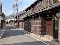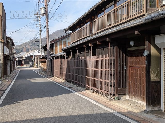 道の両側には、外壁に木の板が張られた木造建物が続きます。