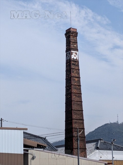 「ゐ」の文字が描かれたレンガ造りの煙突があります。