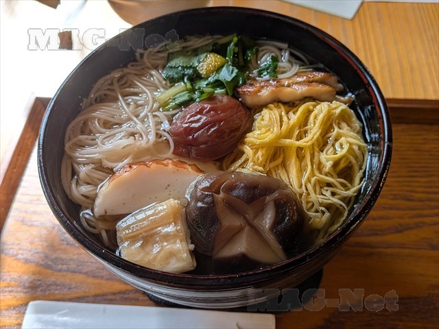 穴子、椎茸、梅、蒲鉾、ゆば,三つ葉、錦糸卵が入ったにゅう麺です。