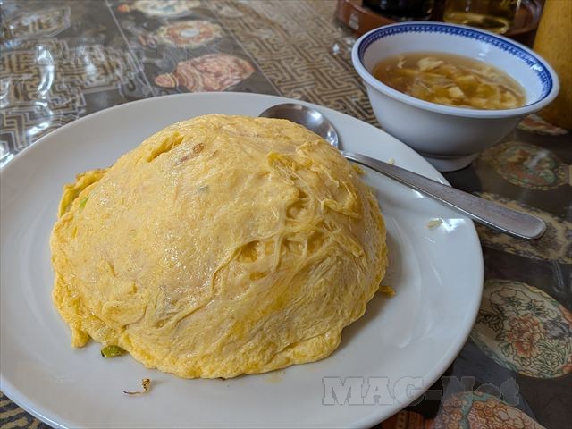 チャーハンが盛られた熱い鍋に、チャーハンの周りに流し込まれる解き卵です。